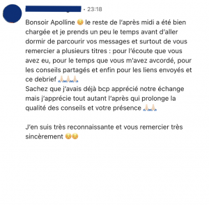 Je vous propose que nous nous appelions, sans engagement de votre part, afin que vous me fassiez part de votre situation actuelle et de vos attentes. Nous verrons ensemble comment je peux vous aider et vous pourrez évaluer si vous vous sentez à l’aise avec moi pour que je vous accompagne.